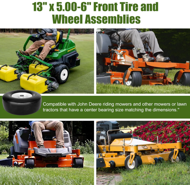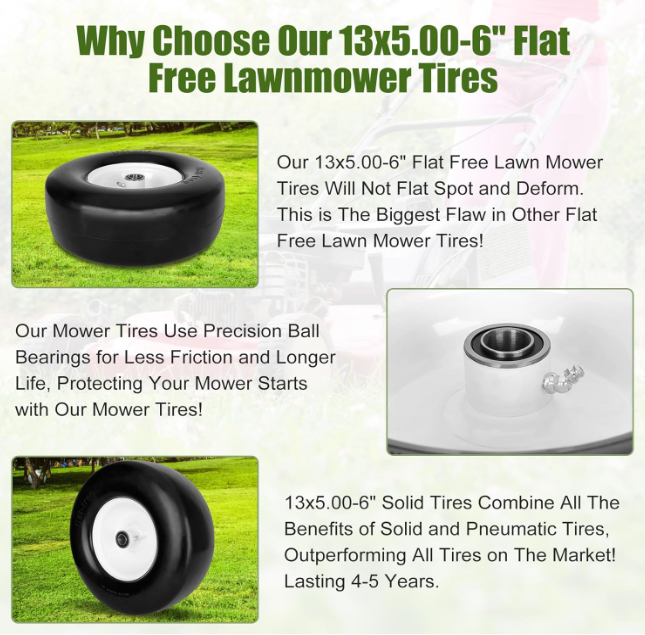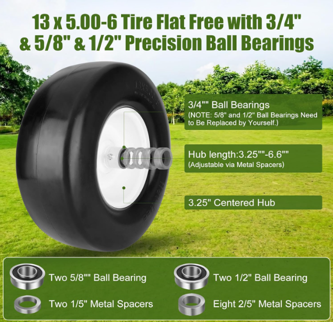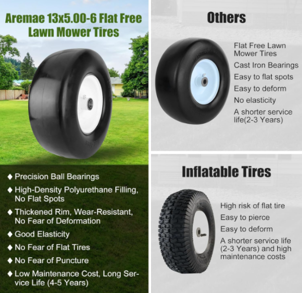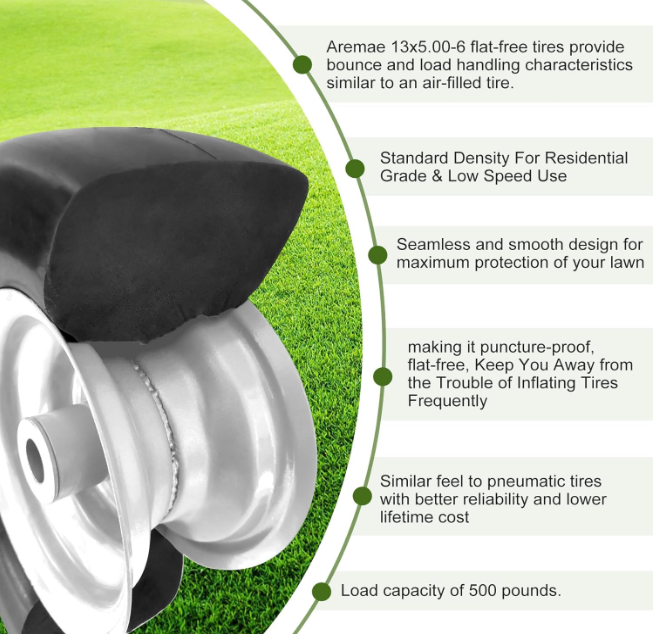 In summary, the Aremae 13×5.00-6 Flat Free Tire & Wheel represents an excellent investment for anyone looking to enhance lawn care equipment. With durable construction, precision bearings, versatile compatibility, and easy installation, this tire and wheel combo stands out as a reliable solution for riding lawn mowers and garden tractors. Don’t let flat tires hold you back—choose Aremae for a smoother, more efficient lawn care experience. Upgrade your equipment today and enjoy worry-free maintenance!